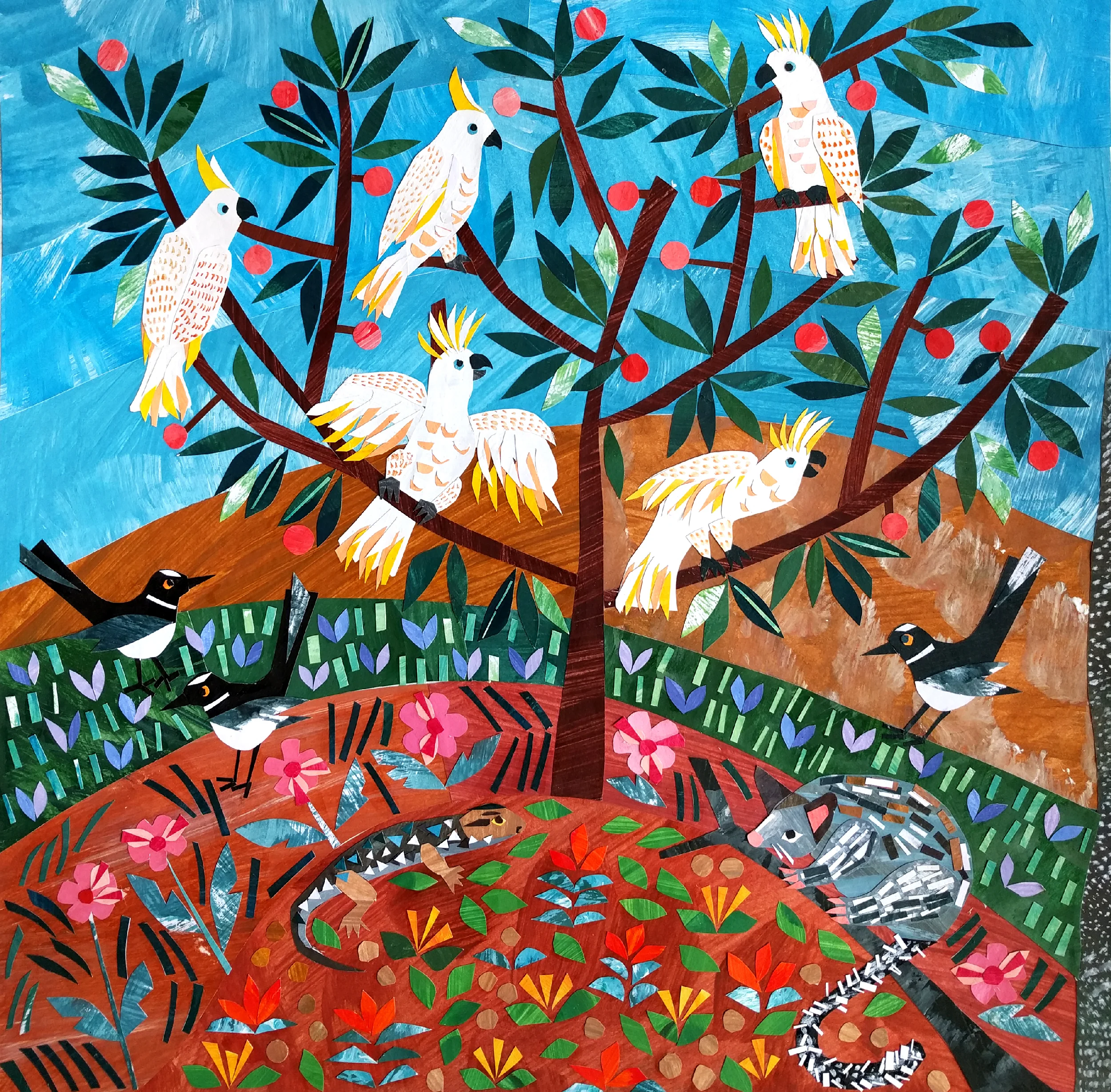 'A Home in the Hills' is a large scale collage of a cottage in the Adelaide Hills that I lived in for a period of time. The Adelaide Hills are a lush and beautiful region, full of bird and animal life. Kookaburras, galahs, native ducks, magpies, rosellas and chickens cheep, cluck, squawk, laugh, crow and warble amongst the sound and sight of sheep baa-ing, horses neighing, dogs barking and kangaroos and koalas in the distance. Prints of this collage will be available soon.