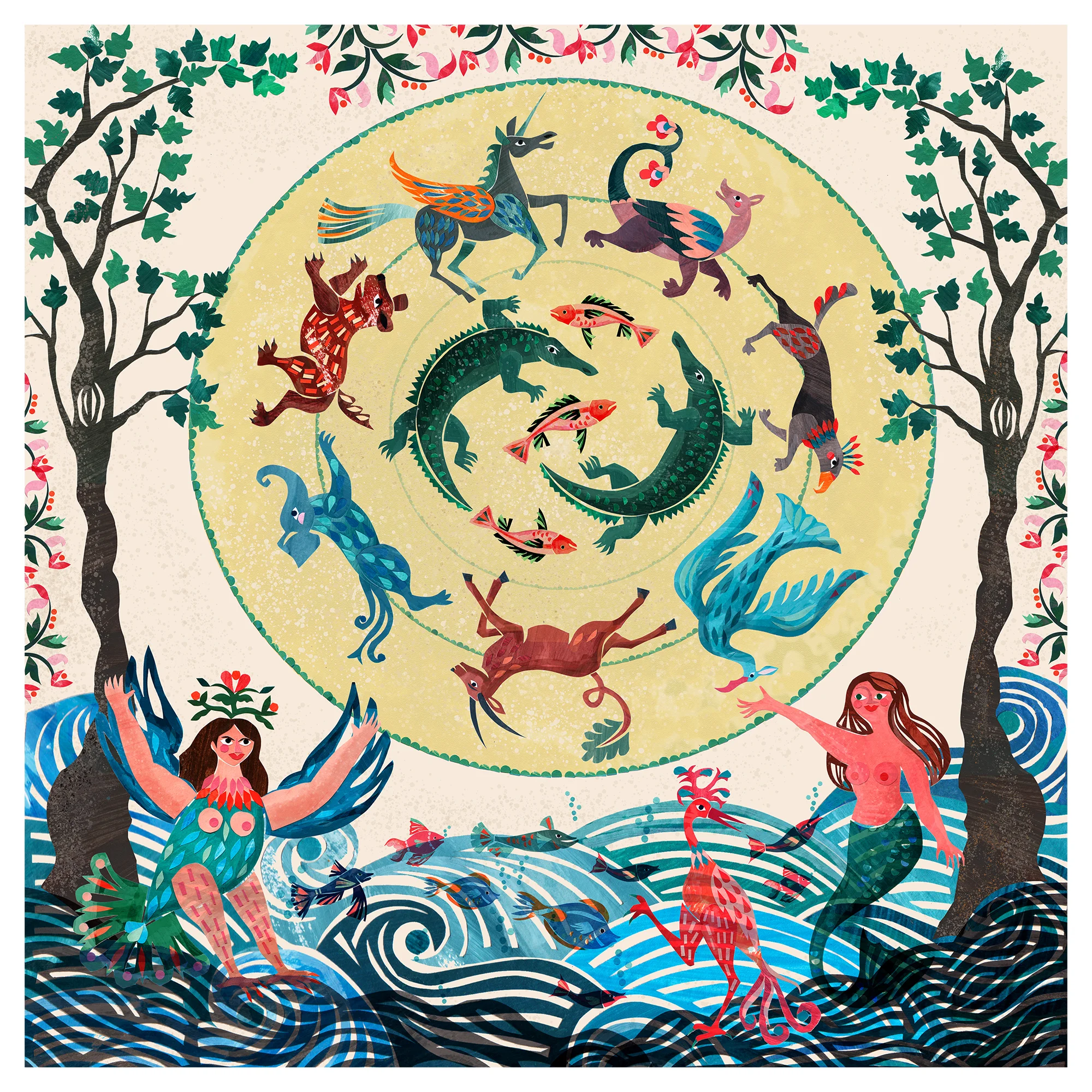 The State Library of Victoria have teamed up with art site Redbubble in a challenge called Create Art History, which invites artists to create their own designs inspired by classic works and reference imagery from the library’s collection. I chose the theme ‘Weird and Wonderful Creatures’, a collection of fantastical beasts from a selection of rare books the library owns. These books date back to 1493 and are from a period of increasing discovery and exploration of the natural world, which artists of the era responded to with wonder and imagination. I based my composition and palette on alchemical drawings being created at the time which similarly sought to understand the physical and spiritual world.